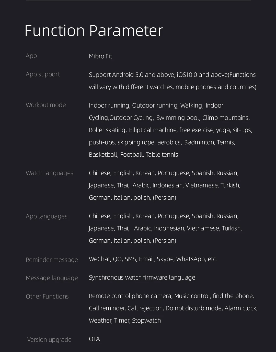 Other Functions: Remote control phone camera, Music control, find the phone, Call reminder, Call rejection, Do not disturb mode, Alarm clock, Weather, Timer, Stopwatch